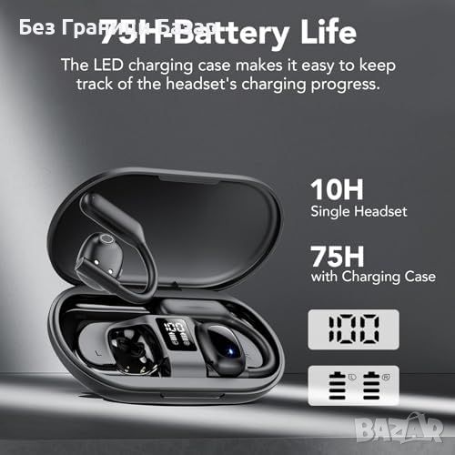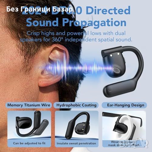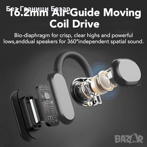 Отворен дизайн за естествено носене, намаляващ натиска и потта Bluetooth 5.3 за бърза и стабилна връзка Висококачествено аудио с 16.2мм динамични драйвери и биодиаграма IPX5 водоустойчивост и ергономичен дизайн 75 часа възпроизвеждане с LED кутия за зареждане Многофункционални сензорни бутони за управление на музика и обаждания