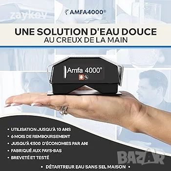 Покритие, Произведено в Холандия - С над 25 години опит и регистриран и патентован продукт, омекотител за вода Amfa4000 за цял дом против варовик модифицира кристалната структура на калций и магнезий, за да гарантира, че те не образуват твърд слой варовик. Здравословните минерали остават във водата, но вече не полепват по вашето оборудване и тръби.