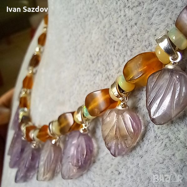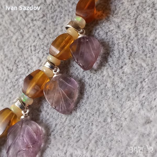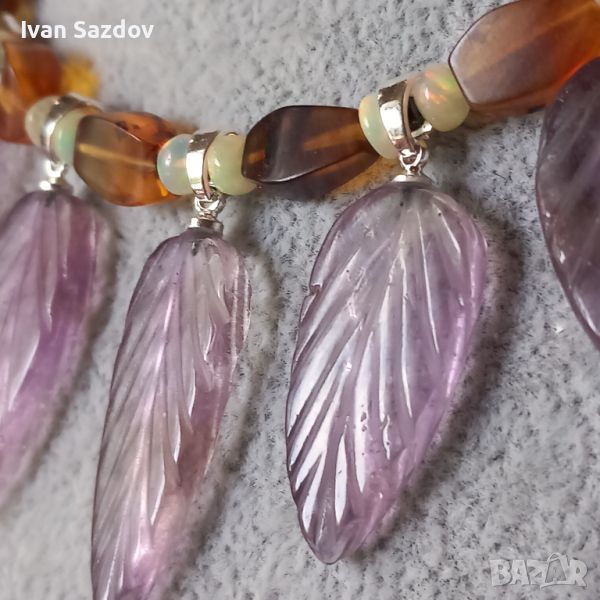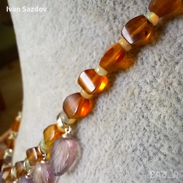 Огърлица от колекцията на Amber house-кехлибарена къща, изработена от натурален Мианмарски кехлибар ( ръчно изработени мъниста),етиопски опал и ръчно гравирани листенца Бразилски аметист