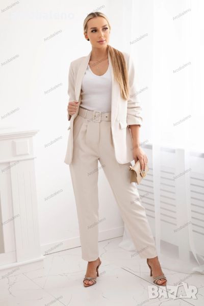Представяме ви елегантен комплект сако и панталон. Сако без закопчаване с предни ревери. Якето е с подплата. Панталон с джобове и колан. В задната част на панталона има пришит ластик. Много модерен и стилен комплект. Комплектът е изработен от висококачествен материал. Размерът е универсален и ще бъде подходящ за дами с размер S, M или L.
