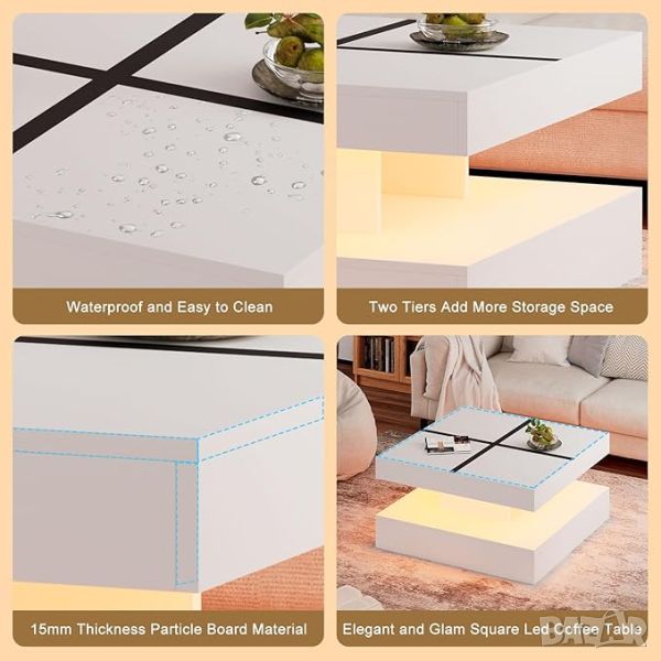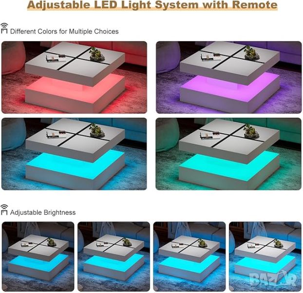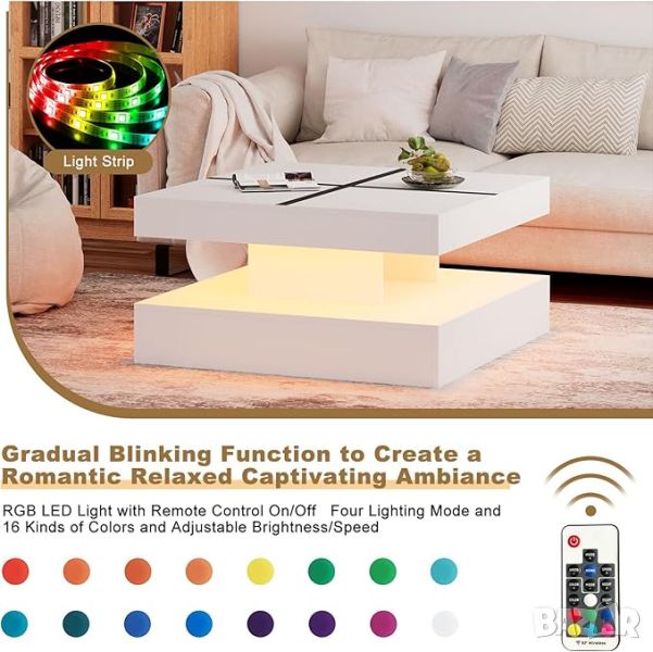 【20 цветни LED маси за кафе и 4 режима на осветяване】 Издигнете всекидневната си с нашата зашеметяваща LED маса за кафе, включваща 20 цветни опции за осветление, за да създадете перфектната атмосфера за всеки повод.