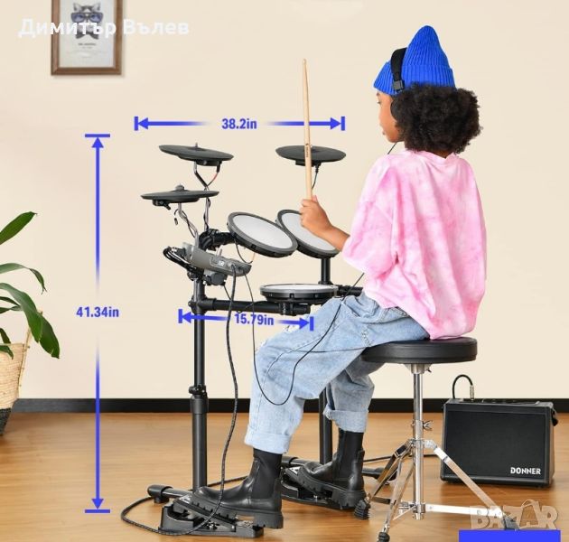 Електрически барабанен комплект Donner DED-70 с 4 тихи мрежести барабанни подложки, 2 превключващи педала, преносим и солиден барабанен комплект с Type-C зареждане, 68+ звука, трон, слушалки, стикове, уроци по мелодия