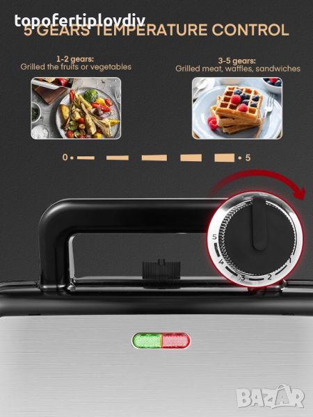 Интелигентен контрол: 5-степенният контрол на температурата ви дава гъвкавостта да приготвяте храната си с различни нива на запичане, както желаете. (Когато бутонът е завъртян на "0", гофретникът ще се изключи, без да се налага да дърпате захранващия кабел)