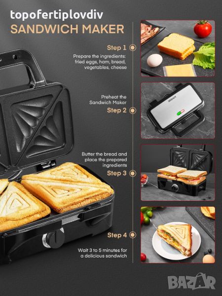Пълно готвене за 5 минути: Мощната скорост на нагряване от 1200 W може да приготви перфектни сандвичи за 5 минути без разливане на съставките, както и вафли и пържене. Светодиодният индикатор за захранване ви позволява да знаете точно кога процесът на печене започва и завършва.