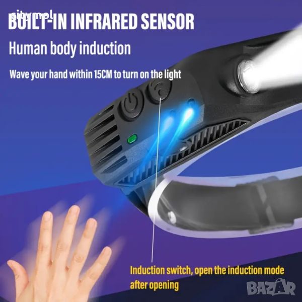 Акумулатореният LED челник има интелигентен сензорен режим, който ви позволява да го включвате или изключвате без натискане на бутони. Светодиодният челник има 7 режима на светене: COB White лента 100%, COB лента 50%, COB Warm лампа 100%, COB лампа 50%, фенер XPE 100%, фенер XPE 50% и мигащ режим (активира се с продължително натискане на ключа).