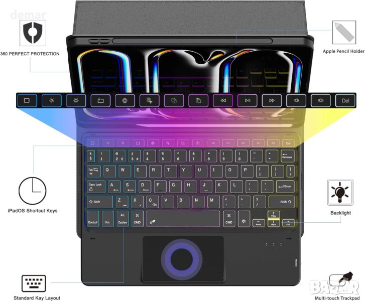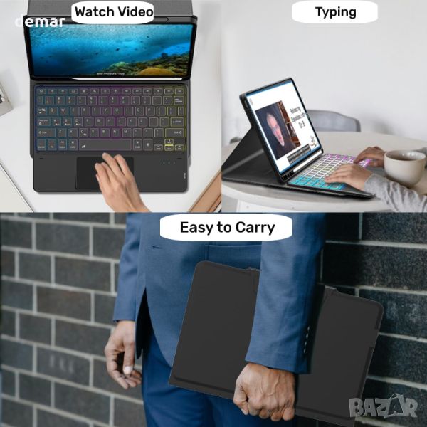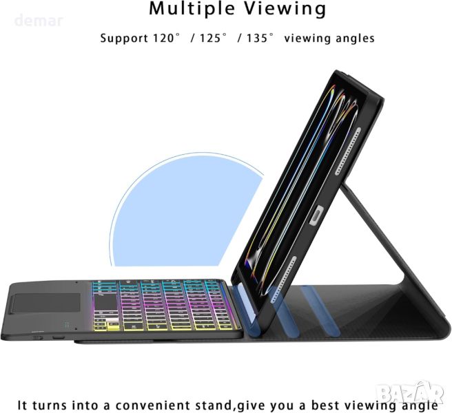 Този специално проектиран калъф с клавиатура с подсветка е съвместим с 2024 iPad Pro 11.0" M4 (модели: A2837, A3006, A2836). С 3-зонова 7-цветна подсветка с регулируема яркост, той предлага просторно оформление за удобно писане. Мултитъч тракпада поддържа различни жестове, превръщайки вашия iPad в изживяване, подобно на лаптоп, без да се нуждаете от мишка. Магнитно разглобяемата Bluetooth клавиатура осигурява гъвкавост и включва полезни преки пътища. Коженият калъф предлага 360° защита, множество ъгли на гледане и държач за молив , идеален за гледане, четене, работа или чатене. Перфектен за срещи, курсове, пътуване или ежедневна употреба, той е страхотен подарък за всеки повод, подобрявайки продуктивността и използваемостта.