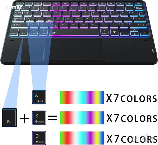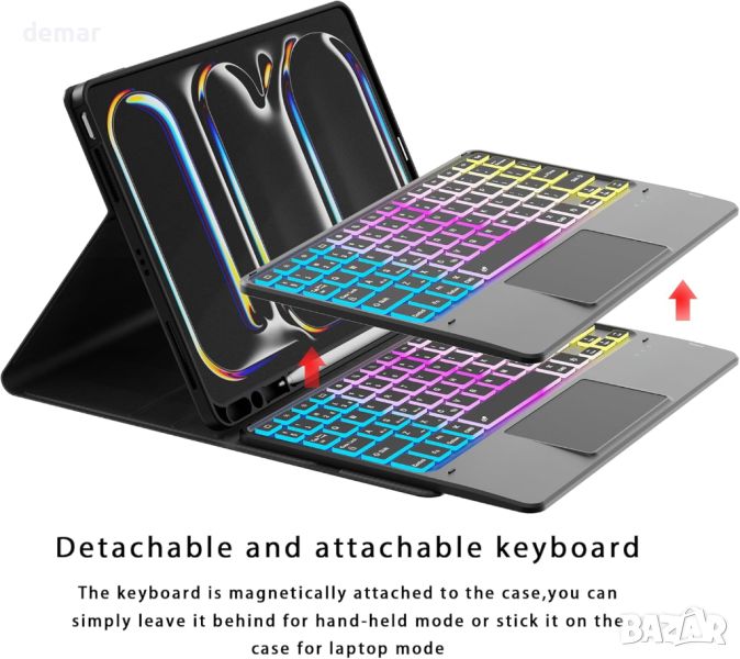 Калъф с клавиатура за iPad Pro 11-inch (M4) 2024, 3 зони и 7 цвята, подвижна клавиатура с подсветка