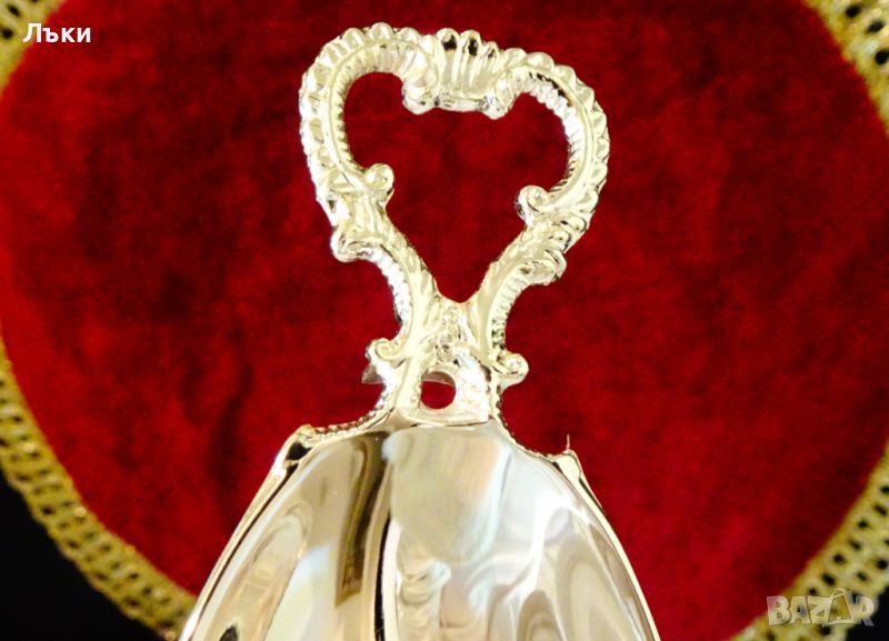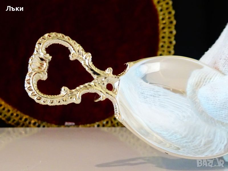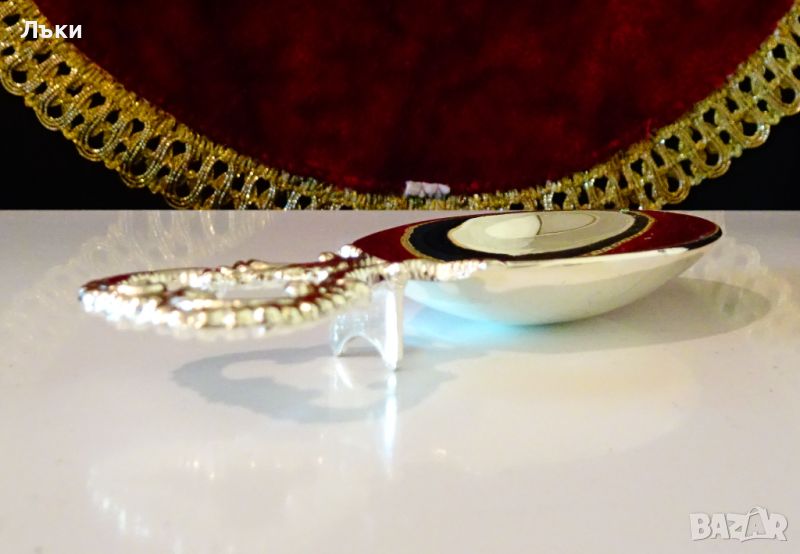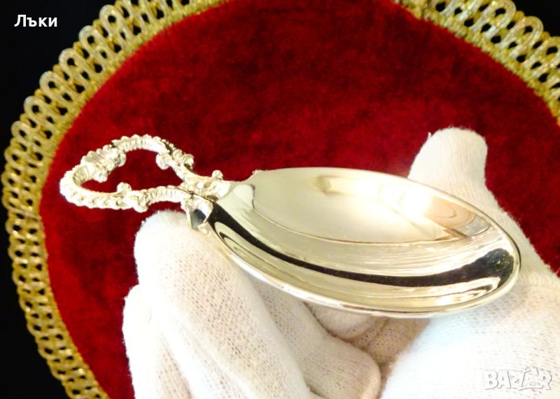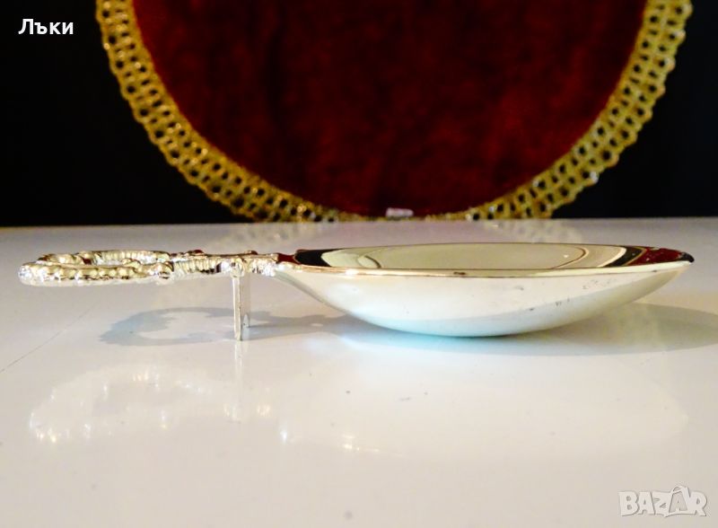 за сервиране на яйце,изработена от цинк,дебело посребрена с висока проба сребро,родирана за блясък и трайност.Има ефектна дръжка с красив бароков релеф