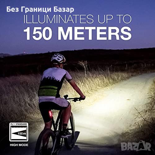 Предна лампа: осветява пътя до 150 метра с яркост 400 лумена