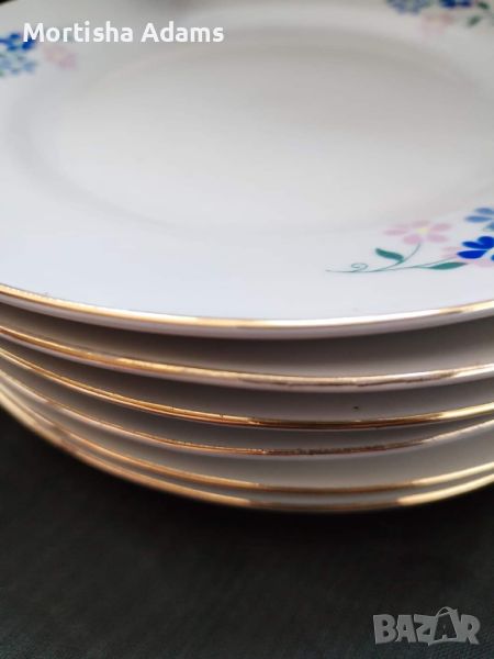 🌸🩵🌸 Български, деликатни и много нежни- шест плитки чинии с диаметър 19см. Употребявани, дребни недостатъци по златния кант и мини "чипчета" на две от тях, невидими от лицевата страна. Интересно е, че са с три различни маркировки.