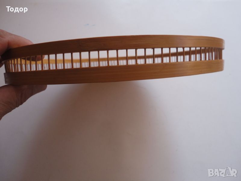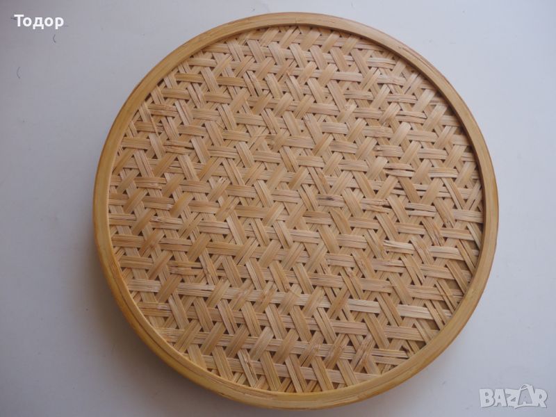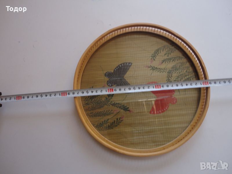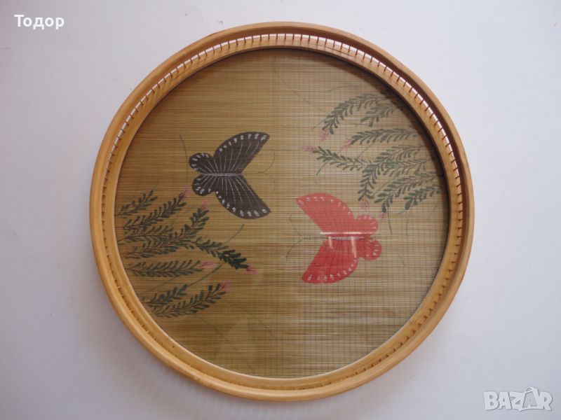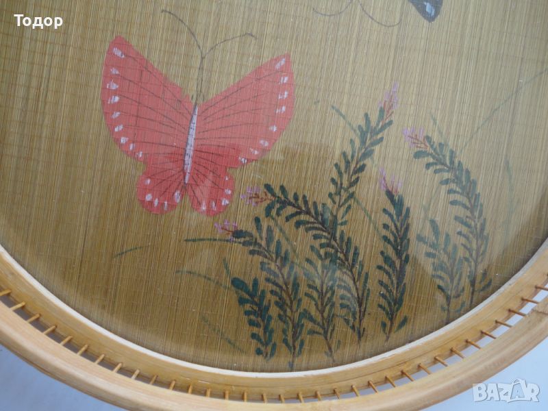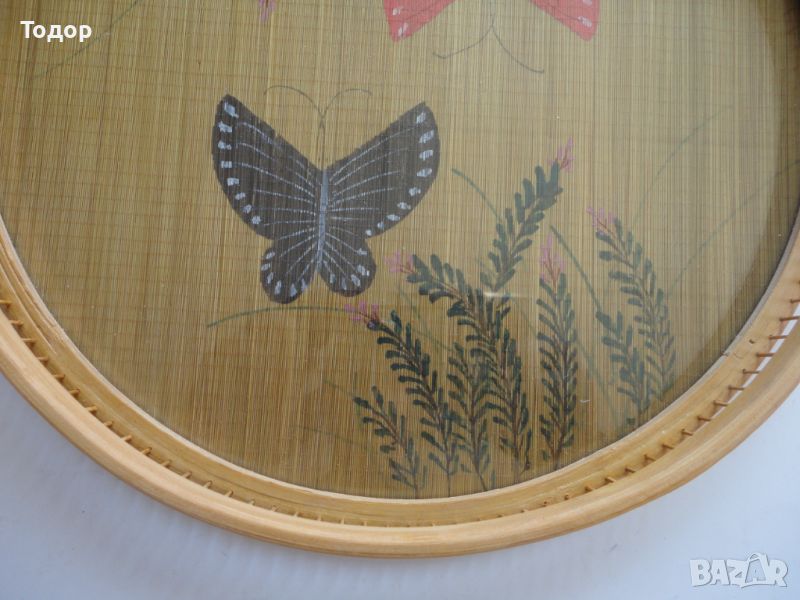 Страхотна ръчна изработка Външен диаметър 29 см вътрешен 27 см Височина 3,4 см Дъното е двойно от оплетка и стъкло като между двете дъна е вкарано платно от бамбук на което са ръчно нарисувани пеперуди Отлично състояние