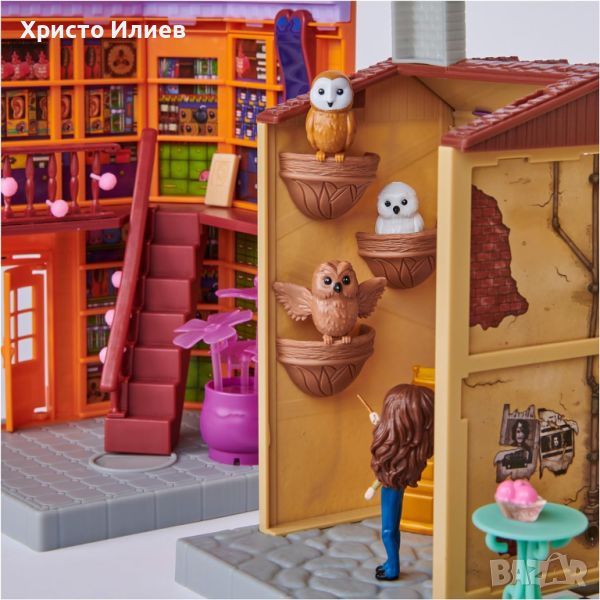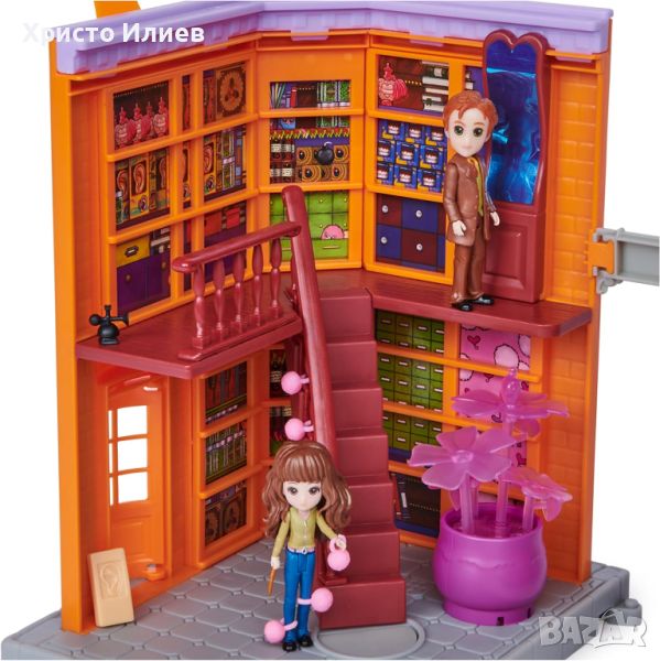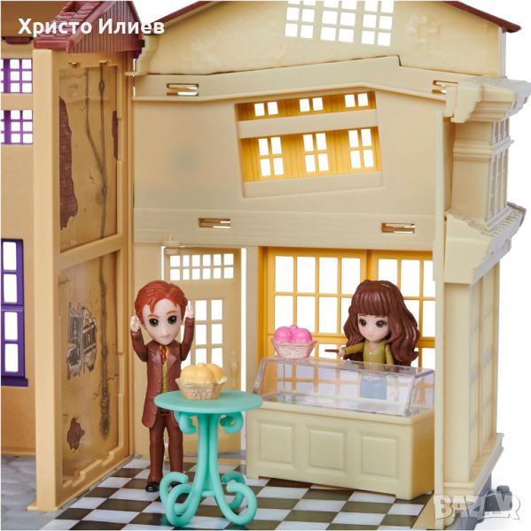 С 2 ексклузивни фигурки, 21 аксесоара и светлини и звуци, играйте в света на магьосниците на Диагон-али. Открийте истински светлини и звуци. Натиснете бутона в долната част на стълбите на магазина за вълшебни звуци и накарайте любовния еликсир наистина да светне с 3 х AAA батерии, които не са включени и трябва да закупите отделно. Вдъхнете живот на магията на Хари Потър с комплекта за игра 3 в 1 Wizarding World Magical Minis Diagon Alley! Този игрален комплект Wizarding World е най-доброто място за вашите приключения, с включени три магазина на Diagon Alley: Weasleys' Wizard Wheezes, Eeylops Owl Emporium и Florian Fortescue's Ice Cream Parlour! С две ексклузивни 8 см кукли Хърмаяни Грейнджър и Фред Уизли, 21 аксесоара и светлини и звуци, Diagon Alley е задължителна играчка за феновете на Хари Потър. Свържете магазините по какъвто желаете начин и преминете направо към забавлението! Помогнете на Фред да зареди рафтовете с разтегателни уши в Weasley' Wizard Wheezes и прикрепете Pygmy Puffs към ръцете му. Натиснете бутона до стълбите, за да активирате светлини и звуци – дисплеят на Love Potion светва с магически звукови ефекти от Diagon Alley! В Eeylops Owl Emporium, поставете гнездата и поставете фигурите на совите вътре. Хърмаяни може да избере домашен любимец и да плати на касата! Когато дойде време за десерт, и двамата герои могат да се насладят на вкусния сладолед в салона за сладолед Florian Fortescue.