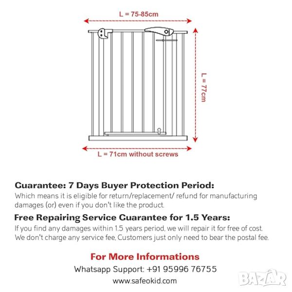 Регулируема ширина: Лесно монтиране на врати и отвори с ширина от 75-85 см. За по-широки отвори се предлагат допълнителни удължителни части за покупка.