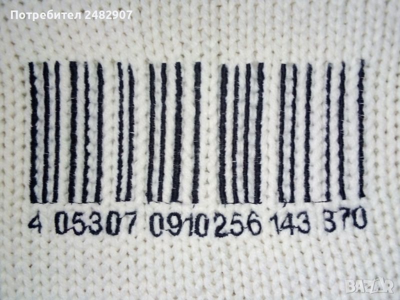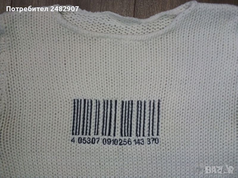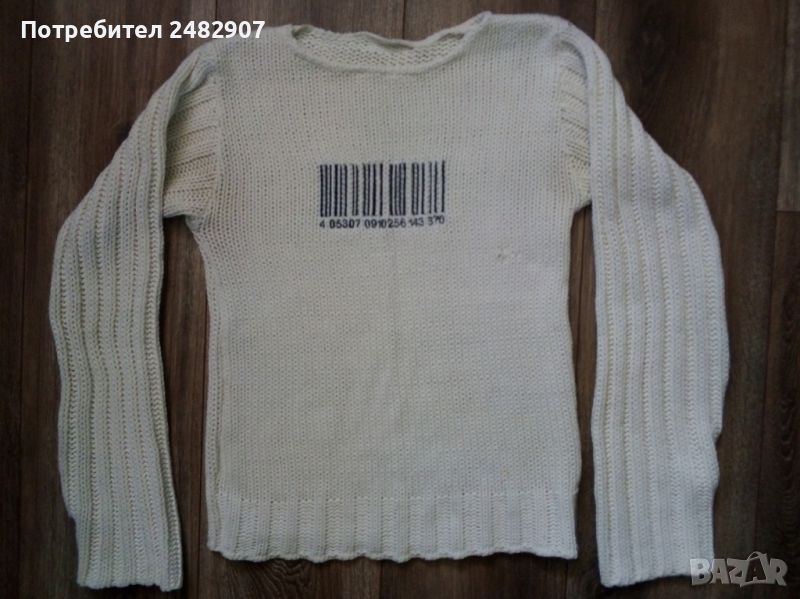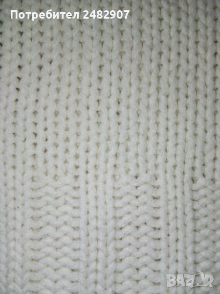 Машинно плетена бяла дамска блуза, размер М. Ширина в раменете - 36 см, ширина под мишниците - 41 см, ширина в долната част - 41 см, дължина от рамото до долу - 56 см, дължина на ръкава от рамото - 64 см, ширина на ръкава в долната част - 12,5 см. Запазена, много малко използвана.