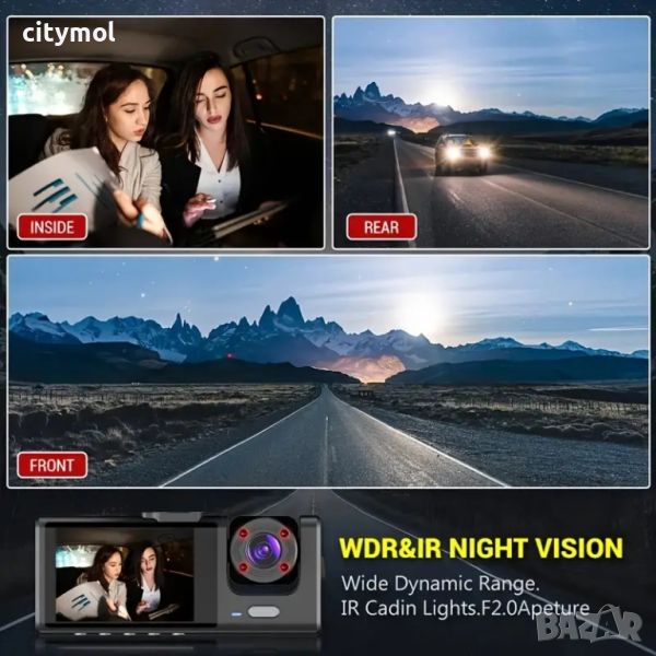 Видеорегистратор с 3 камери, G-Sensor Full HD, нощно виждане,
