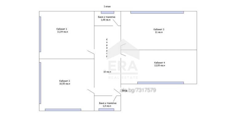Първи етаж: четири просторни кабинета, един от които с обособена модерна кухня и две санитарни помещения.