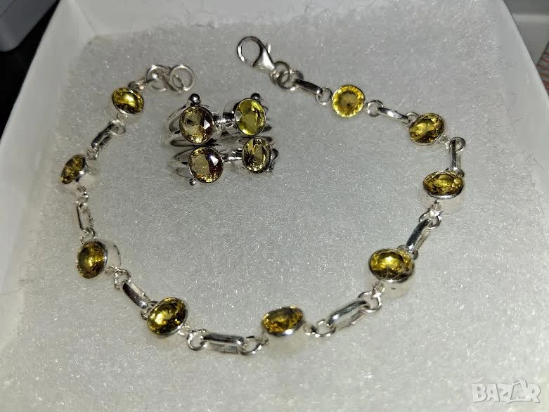 Пръстен и гривна с кръгли цитрини. Комплекта е ръчна изработка. Налични са всички маркировки. Вътрешния размер на пръстена е 17,5мм. На снимките жълтия цвят е излезнал по-тъмен от в действителност. Поотделно пръстен 40лв.,гривна 80лв. Изпращам допълнително снимки на лични. Наличен и същия с перидоти.