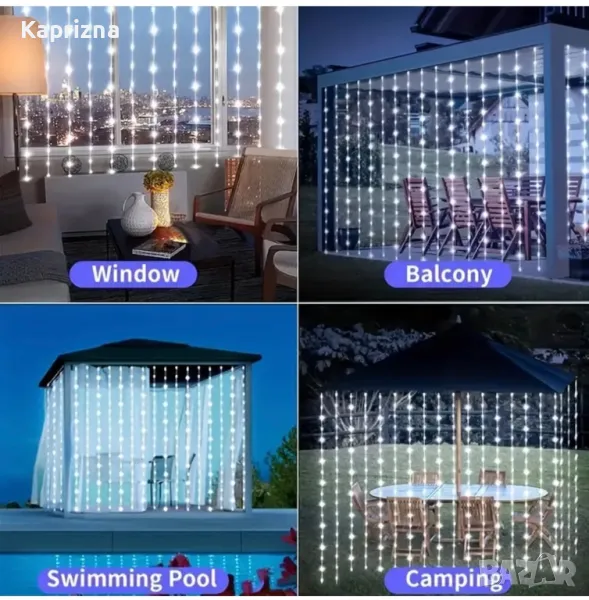 Можете да регулирате и да избирате от няколко режима на осветление, за да персонализирате атмосферата. Степента на защита IP65 прави тази завеса подходяща за използване както на закрито, така и на открито, устойчива на атмосферни влияния и влага.