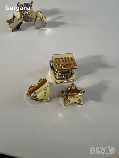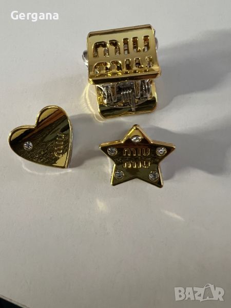 Комплект от 3 броя малки/мини метални фибички Miu Miu: шнолка(2см х 2 см) сърчице(1.5см х. 2см) и звездичка(1.8см х 2см) с камъчета и лого на марката.