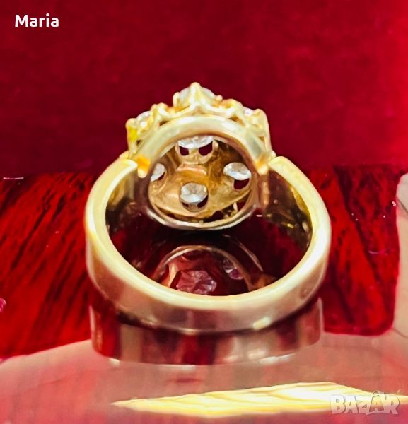 Екстравагантен пръстен с бляскав и иновативен дизайн и много чисти и натурални брилянти . Стилна изработка на композиционните елементи от фино съчетание на жълто злато и емайл .