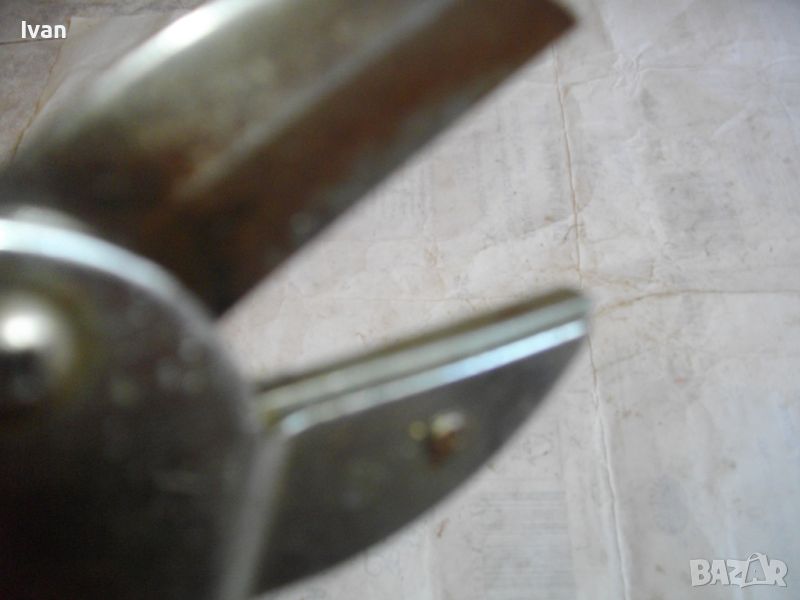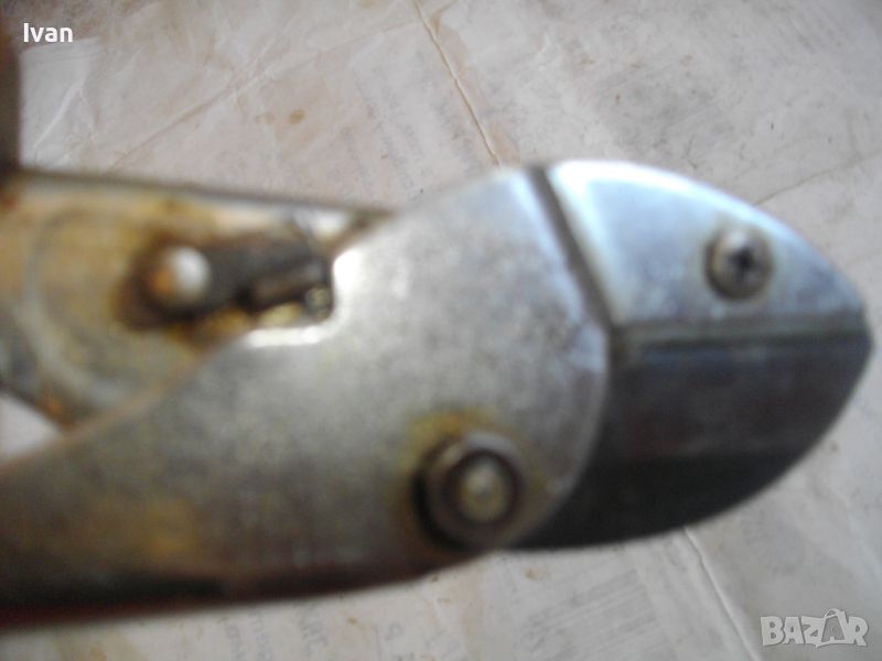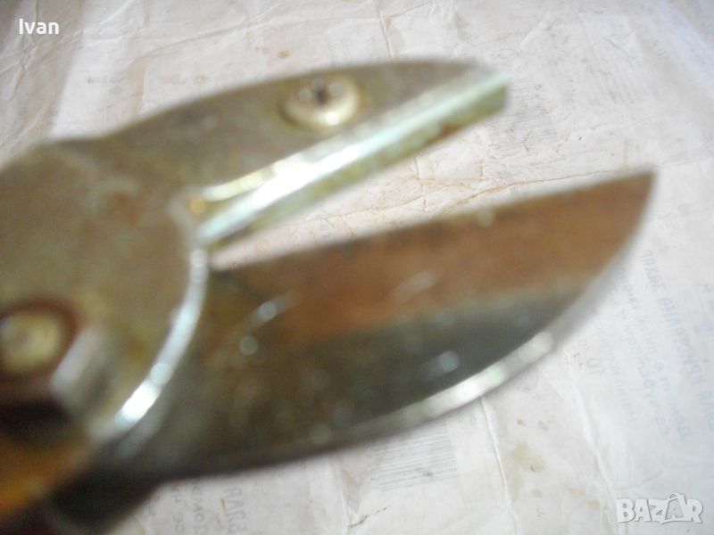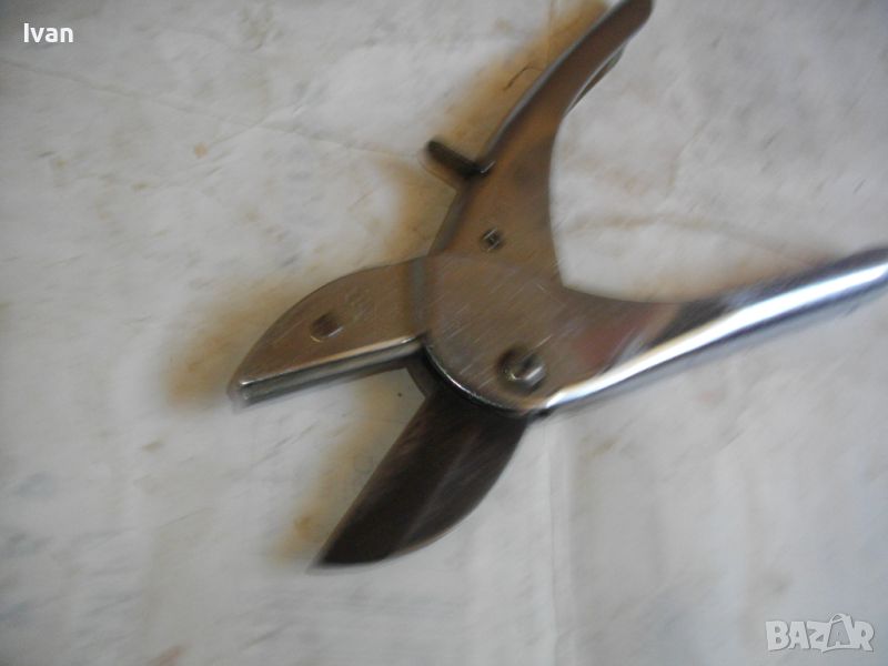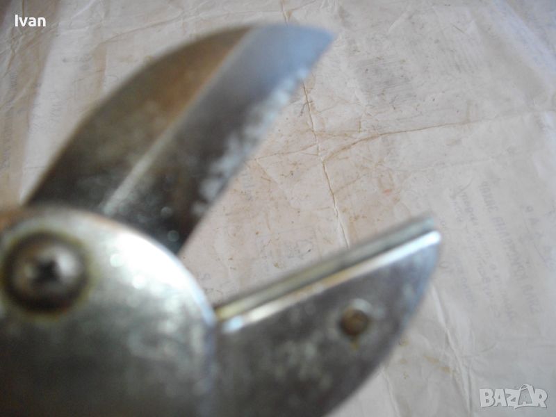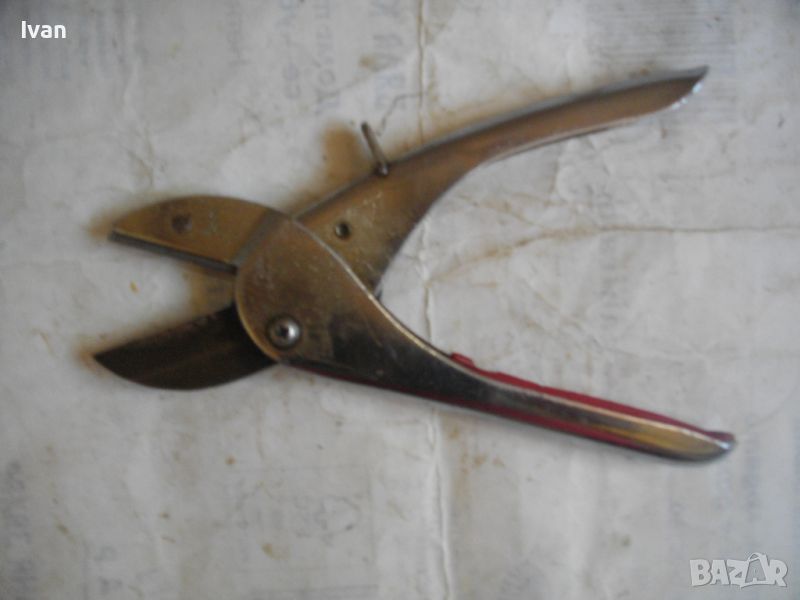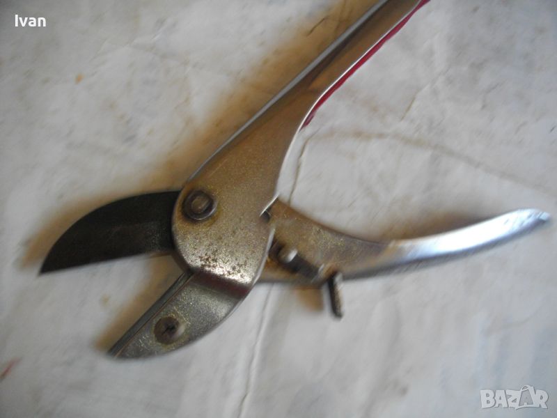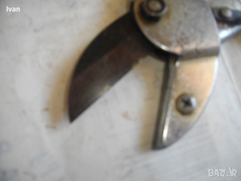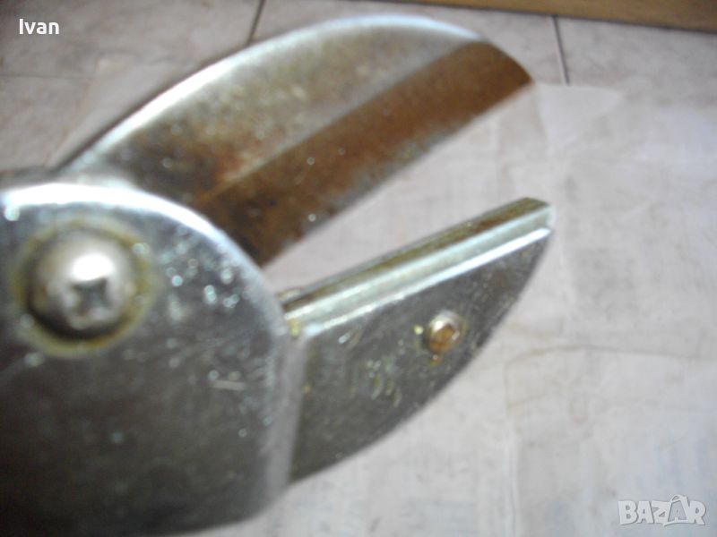 наковалня, като горното режещо острие попада върху нея при рязане. Наковялнята на острието е сменяема. Метален вграден ограничител за пръстите при захвата на ръката. Отлично състояние на инструмента. Предназначение - за градински и селскостопански дейности