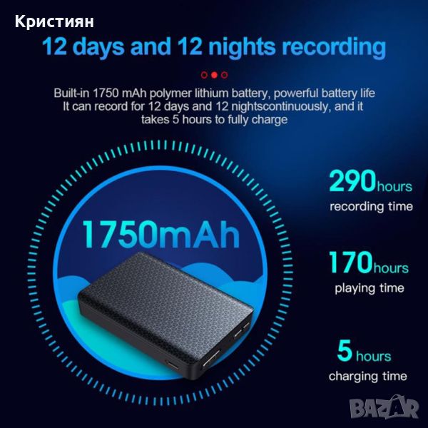 Подслушвател аудио записващо устройство скрит запис глас рекордер 300 часа