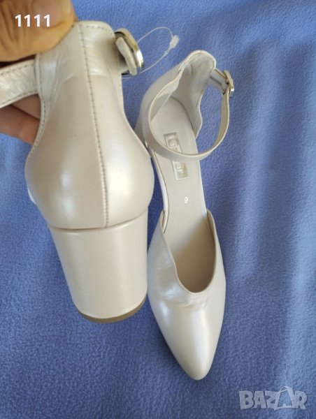 Обувките са много елегантни.Приятен перлен цвят.Мека естествена кожа.Слъпа и качествена изработка.Номер 43 с дължина на стелката 28,5см.Височина на тока 5см.Цена 50лв.