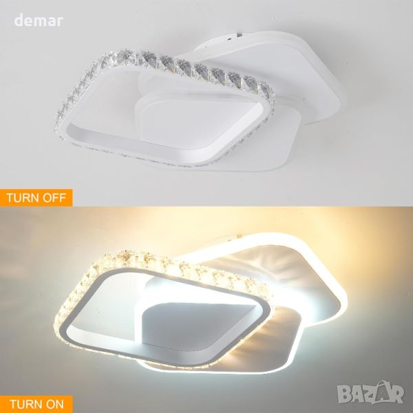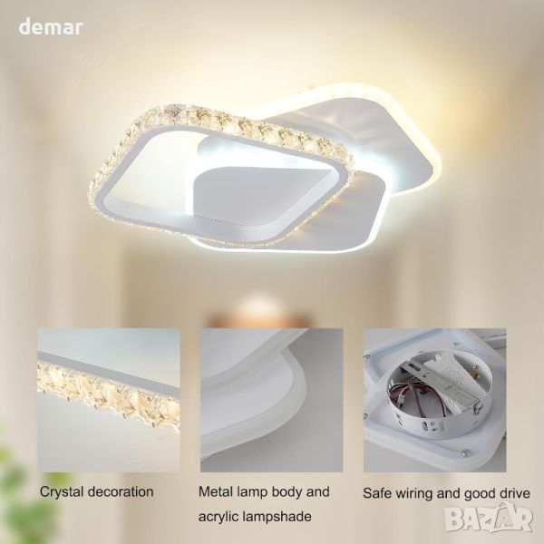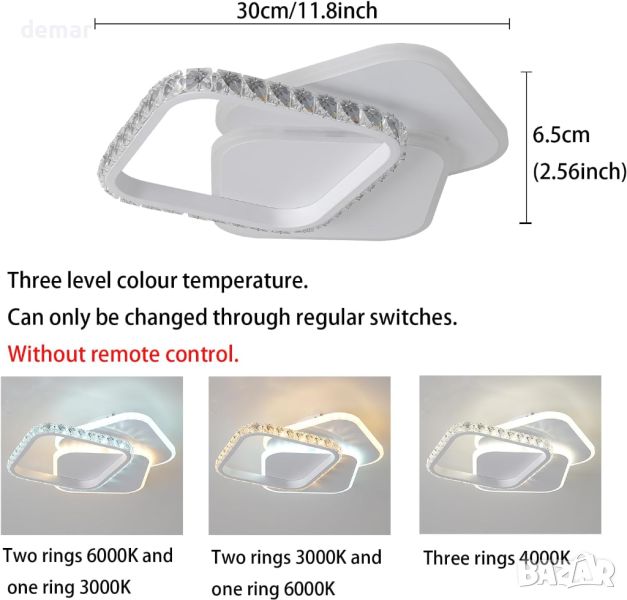 Малката LED таванна лампа се отличава с модерен, семпъл и елегантен дизайн с 20W LED светлинен източник. С размери 11,8 инча (30 см) на дължина и ширина и 2,56 инча (6,5 см) височина, той предлага три нива на цветова температура: 6000 K за два пръстена и 3000 K за един пръстен, 3000 K за два пръстена и 6000 K за един пръстен и 4000 K и за трите пръстена, регулируеми чрез обикновени ключове без дистанционно. Тялото на лампата е изработено от метал с акрилен и кристален абажур за висока светлопропускливост и меко осветление. Това енергийно ефективно приспособление спестява до 85% от сметките за електричество и може да се похвали с живот от над 50 000 часа. Идеален за малки закрити помещения, подходящ за дневни, спални, трапезарии, кухни, детски стаи, антрета и коридори.