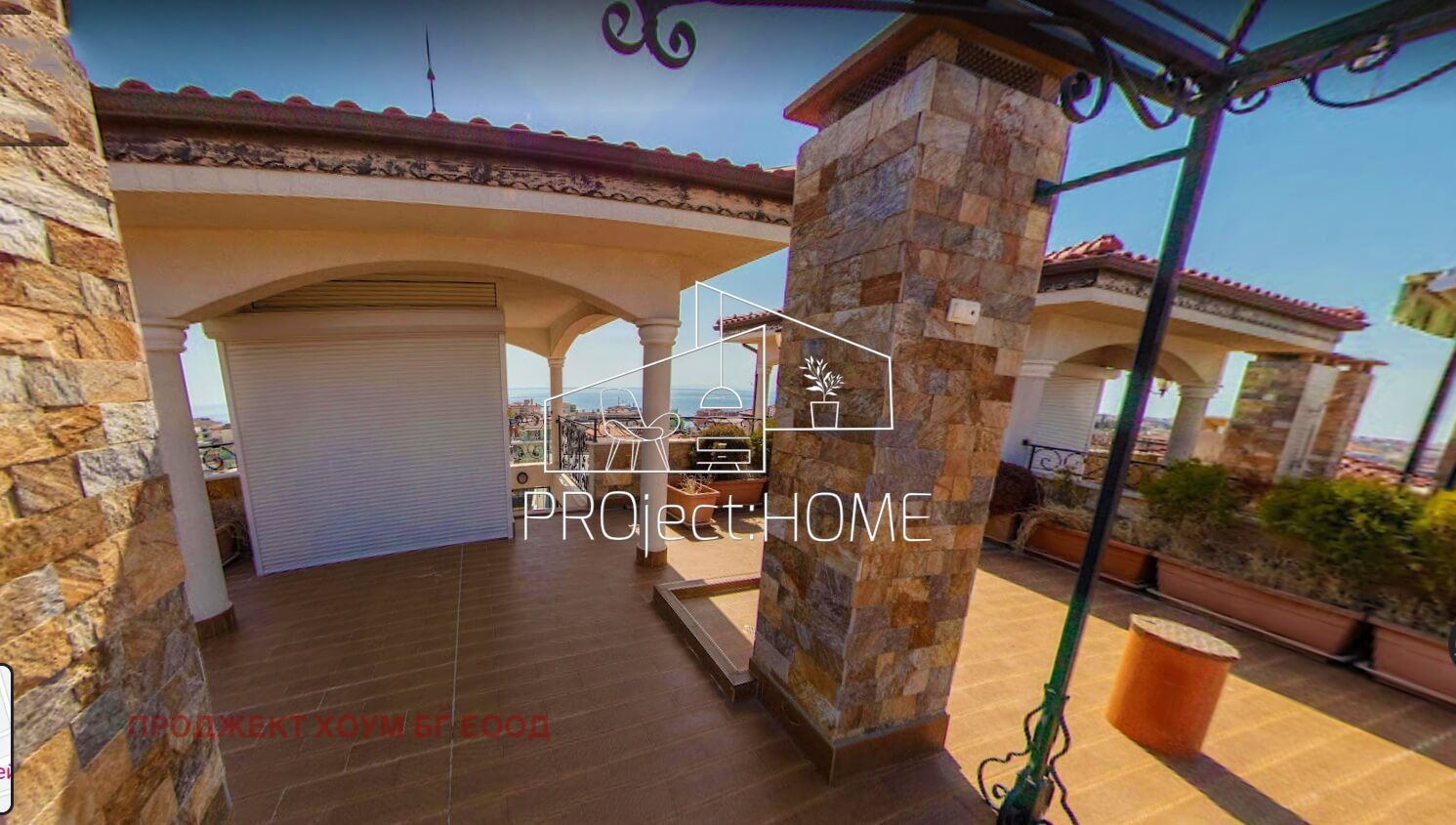 3-то ниво: просторна тераса с ПАНОРАМЕН ИЗГЛЕД КЪМ МОРЕТО, която има комуникации за хидромасажна вана, душ кабина, лятна кухня, барбекю, покрита беседка.