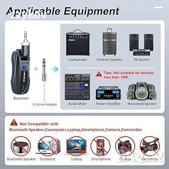 Приложимо оборудване: Тази система е подходяща само за обществени високоговорители, миксери, усилвател на мощност, камери и друго оборудване с 3,5 мм/6,35 мм (1/8 инча или 1/4 инча) вход за аудио/микрофон. Този продукт не е съвместим с мобилни телефони, компютри или малки високоговорители само с Bluetooth функция.