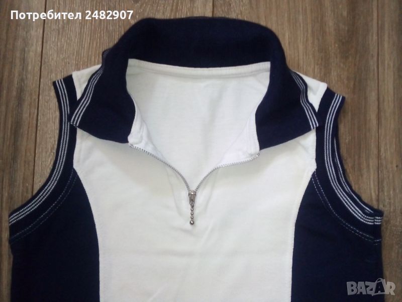 Дамски потник с яка и цип в бяло и тъмно синьо, размер S. Съдържа 100 % памук. Ширина в раменете - 33 см, ширина под мишниците - 41 см, ширина в долната част - 43 см, дължина от рамото до долу - 52 см. Много запазен, с нормални следи от износване.
