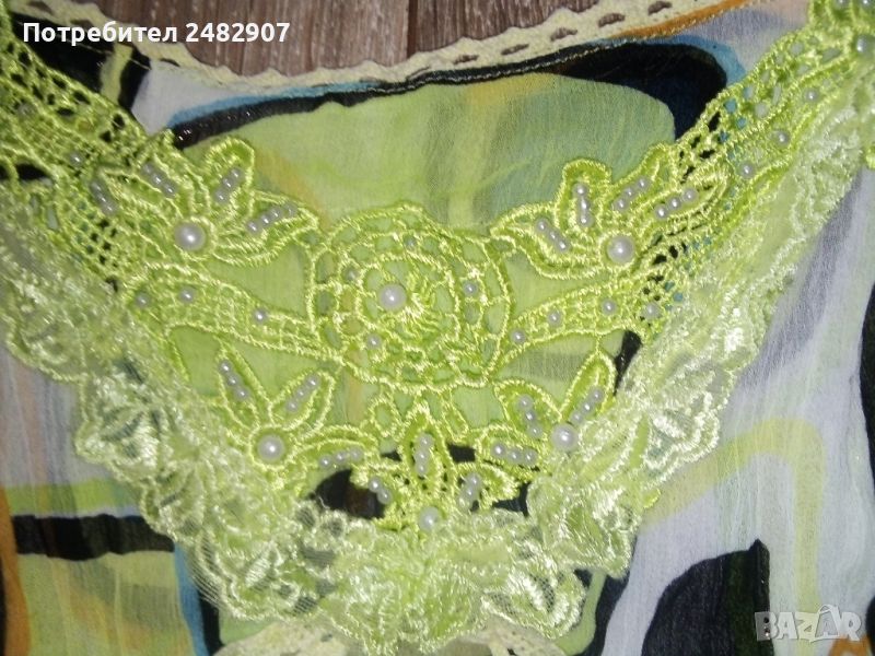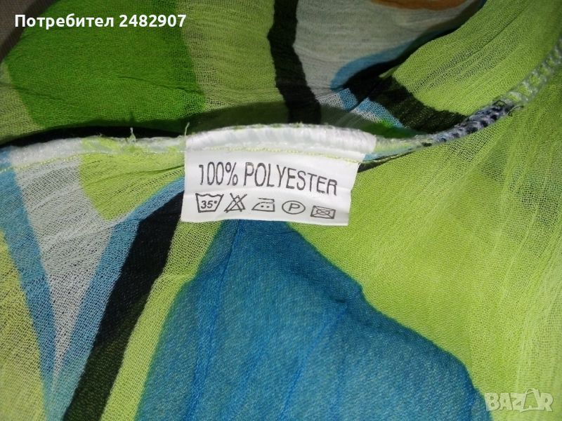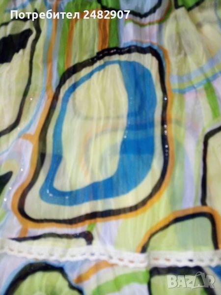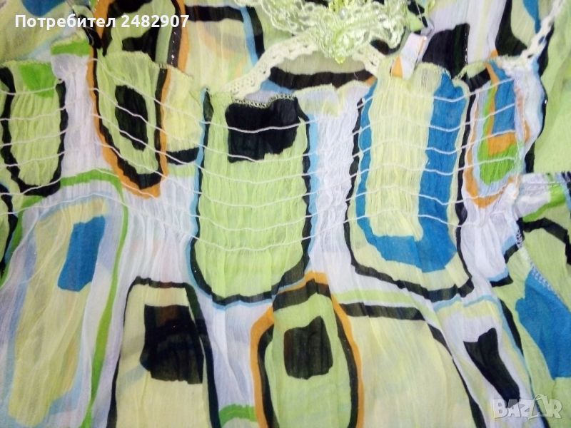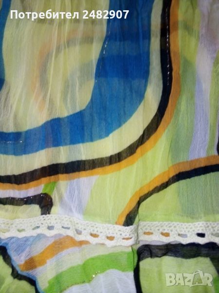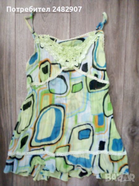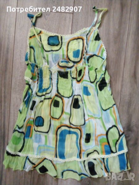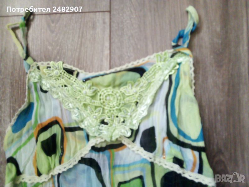 Дамски потник с намачкан ефект и регулируеми тънки презрамки, размер S. Съдържа 100 % полиестер. Ширина под мишниците - 32 см, ширина в долната част - 54 см, дължина от под мишниците до долу - 40 см. Много запазен, почти не е използван, прозрачен, разтеглив.