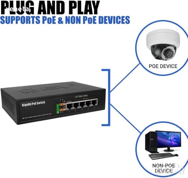 BV-Tech 5-портов гигабитов PoE комутатор (4 Gigabit PoE порт + 1 Gigabit Uplink) – 65W – 802.3af/at → Обява 46789086