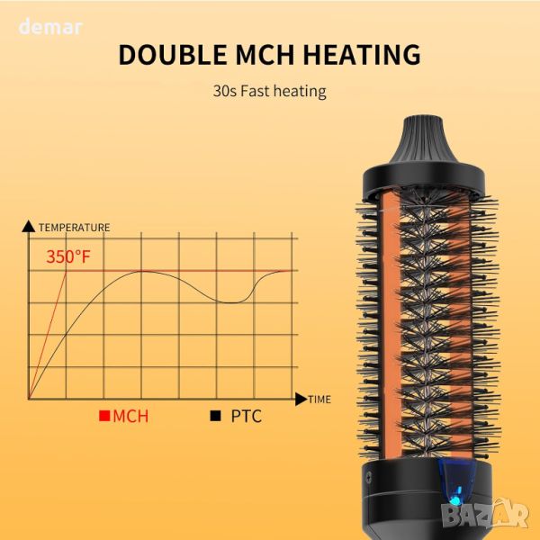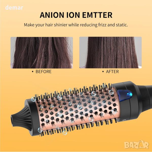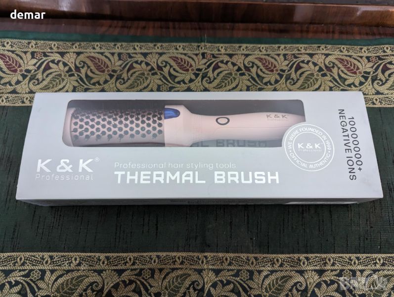Thermal Brush е нагрята кръгла четка, предназначена да изглажда и оформя косата, създавайки сензационен обем без използване на въздух. K&K Ionic Hot Curl Brush разполага със супер йонна генерация за елиминиране на статичното електричество и накъдрянето, с титаниев корпус от розово злато и найлонови влакна, идеални за меки, копринени къдрици. Този многофункционален инструмент съчетава пръчка за къдрене и гребен, което ви позволява да къдрите, изправяте и разресвате косата си без усилие. Кръглата глава на четката има найлонови влакна против изгаряне и хладен връх, с гумирана дръжка за сигурен захват и автоматично изключване за 60 минути за безопасност. Той предлага двойно напрежение (100V-240V) за удобство при пътуване, с въртящ се на 360 градуса захранващ кабел, който се разтяга до 2,5 m за бързо и ефективно оформяне в движение.