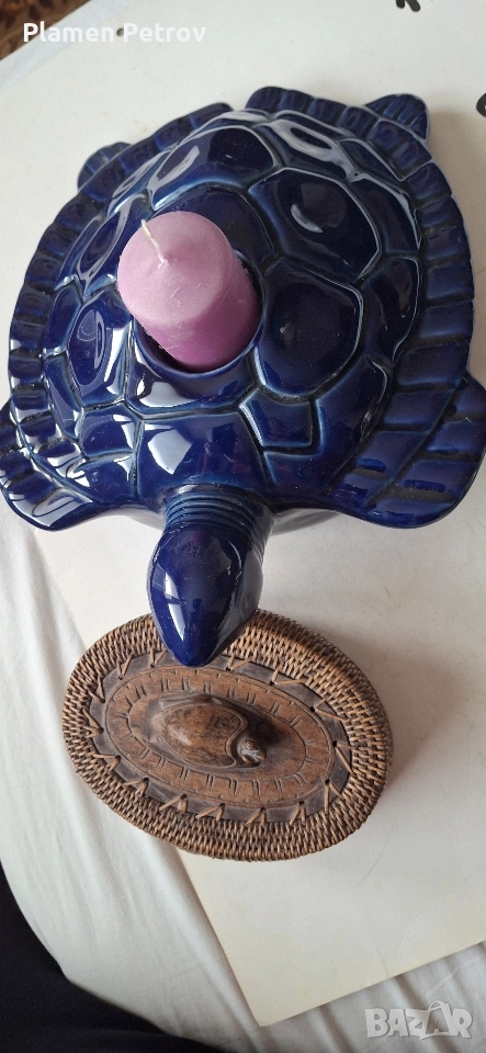 Голяма порцеланова синя костенурка свещник с размери от 28см дължина и ширина 22,7см