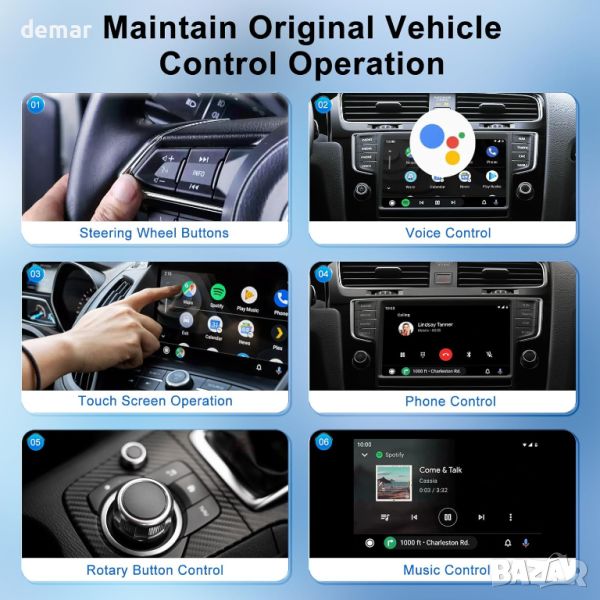 Безжичният Android Auto Adapter свързва вашия телефон безпроблемно след първоначалната настройка и стартира автоматично с двигателя на вашия автомобил, елиминирайки необходимостта от ръчно свързване на вашия телефон. Отличава се с компактен, преносим дизайн и ефективно разсейване на топлината за издръжливост и стабилност. Адаптерът поддържа гласово управление, управление от волана и работа с бутони, което ви позволява да използвате карти, да слушате музика, да провеждате разговори и да изпращате съобщения безопасно, докато шофирате. Той е универсално съвместим с повечето модели автомобили 2018-2024 г., оборудвани с кабелен Android Auto, поддържащи Android 11.0, но не и iPhone.