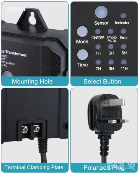 Този трансформатор от 65 W преобразува 240 V AC в 12 V DC, като автоматично включва пейзажното осветление при здрач и изключва на зазоряване. Той разполага с таймер за обратно броене с шест настройки (1/3/5/7/9/11 часа) и функция за памет, която запазва настройките след прекъсване на захранването. Лесен за инсталиране с вграден отвор за окачване, той изисква водоустойчива обработка за окабеляване и предлага защита от претоварване и късо съединение чрез автоматичен прекъсвач. Изработен от огнеупорен, устойчив на атмосферни влияния материал, той е съвместим с различни пейзажни LED светлини с ниско напрежение DC12V, гарантиращи издръжливост и безопасност при всякакви условия.