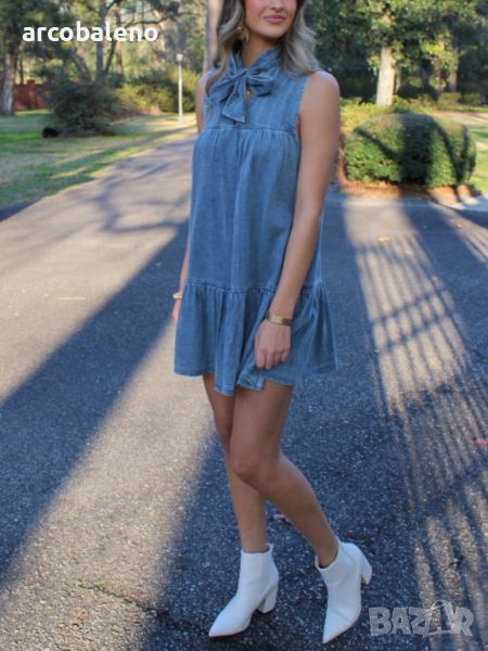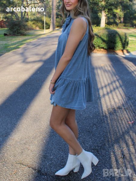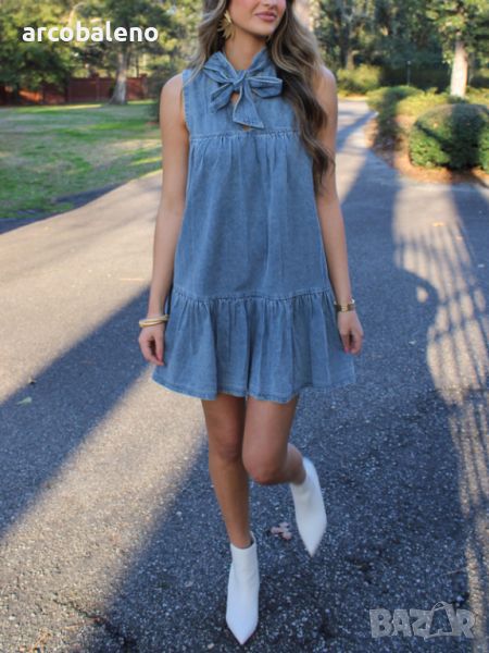 дънкова рокля е идеална за ежедневни поводи и се отличава с дизайн на вратовръзка отпред, който добавя нотка стил. Тази рокля е задължителна във вашия гардероб.