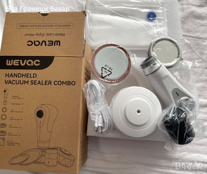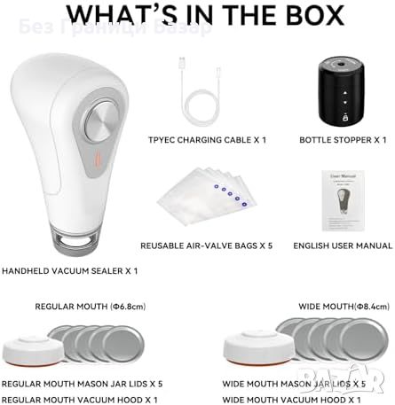 Комплектът включва: Вакуумен уплътнител, капаци за буркани, вакуумни торби, тапи за бутилки и Type-C кабел.