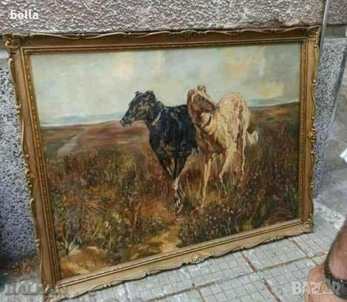 Едно уникално произведение в огромен размер -Хрътки-,картината е донесена от чужбина и е много стара,масло,платно,рамкирана,размера е 1,40/1,10 см,няма подпис,гледана е от доста видни художници по тяхно мнение е майсторска творба,уникално изпълнение,не е давана на експертна оценка,не мога да я снимам добре заема за да хвана точните цветове и размери, почти една стена ,но за повече снимки ми пишете,седи величествено и стилно.Качена е отново с нови снимки на светлина.Цена 3000 лв