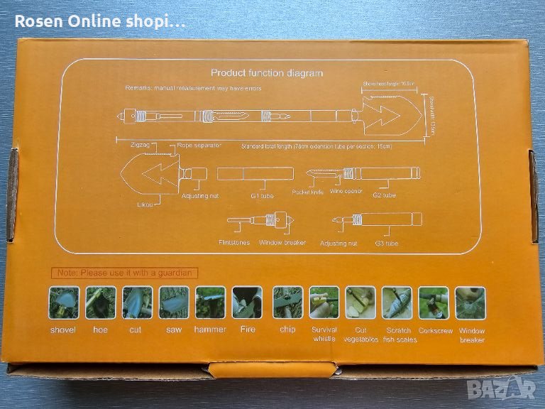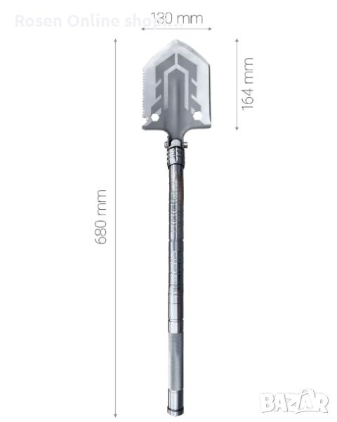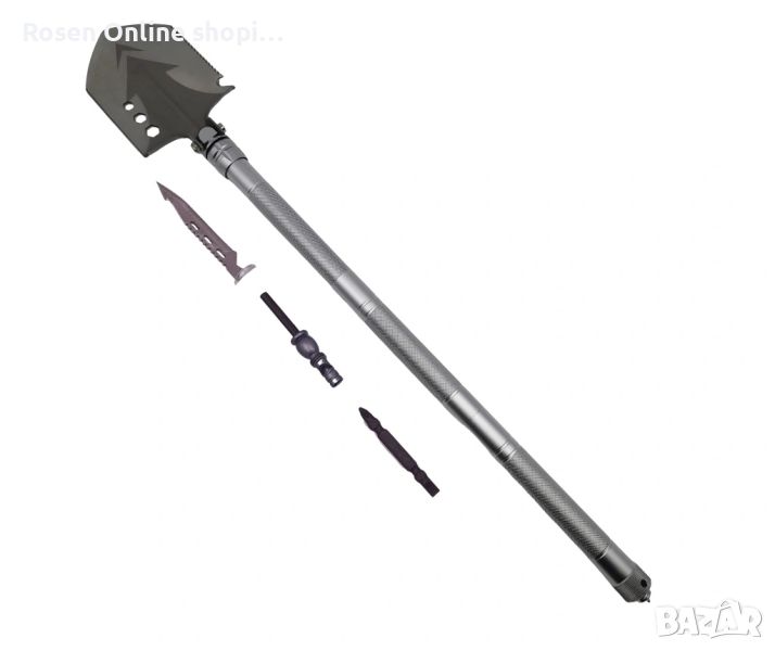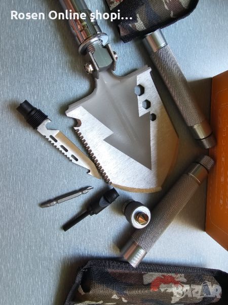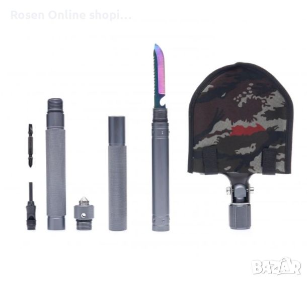 Вместо да използвате различна екипировка вече можете да разчитате на качествени, мулти-инструменти, които да вършат цялата работа. Тази многофункционална лопата може да бъде вашият доверен инструмент във всяка нужда. Конструкцията от алуминиева сплав с авиационен клас прави този инструмент здрава лопата, трион, мотика, кука и др. Между тях скрити в дръжката ще намерите изключително ценни инструменти( инструмент за запалване на огън, отварачка за бутилки, нож и др.) за вашият риболов, преход, къмпинг и др. Сглобяемата дръжка от 3 части улеснява употребата на различните инструменти в комплекта.
