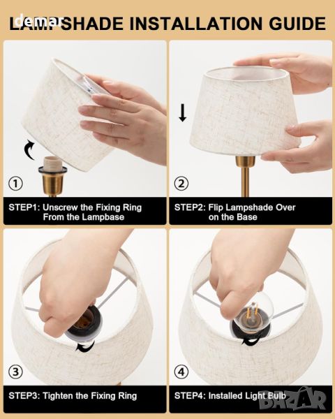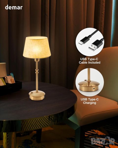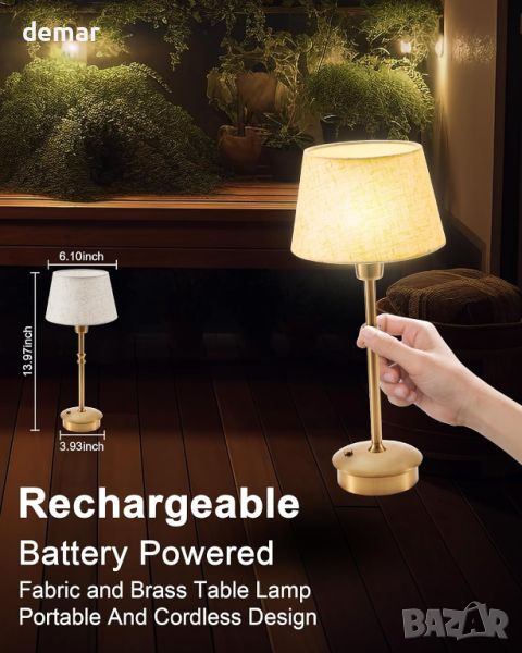 абажур от истински плат, покритие от античен месинг и метална основа, подобряваща естетиката на домашния декор или масата за хранене. С размери 35,5 см височина, 10 см диаметър на основата и 15,5 см диаметър на горния абажур, той включва 5000 mAh акумулаторна батерия, USB тип C кабел, LED крушка и ръководство за потребителя. Напълно зареден за 4-5 часа, издържа до 24 часа при най-ярката настройка и 48 часа при най-слабата. Сензорният превключвател предлага 3-степенна настройка на яркостта, подходяща за околна светлина или светлина за четене.