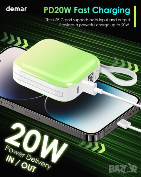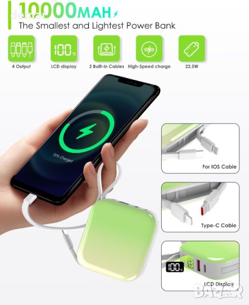 Преносимо зарядно Mini Power Bank, 22,5 W 10000 mAh, с вградени iOS и USB-C кабел
