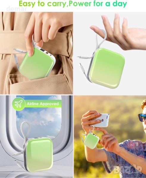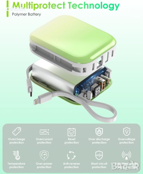 Едно от най-тънките и леки преносими зарядни устройства с капацитет 10 000mAh, с тегло 179 грама и размери 7,7x7x2,5 сантиметра осигурява 3,2 зареждания за iPhone 8, 1,6 за iPhone 15, 1,3 за Huawei P60 и 20 за AirPods Pro. Оборудван с PD 20W USB-C бързо зареждане, той предлага до 16 часа възпроизвеждане на видео с 30-минутно усилване и се зарежда напълно за 2,5 часа. Разполага с вградени IOS и USB-C кабели за удобство, съвместими с iPad, iPhone, Samsung и други устройства. Може да зарежда до 4 устройства едновременно с 4 изходни порта. Включва интелигентни функции за безопасност и цифров дисплей. Пакетът включва 10 000 mAh захранваща батерия, USB A към USB C кабел и ръководство за потребителя.