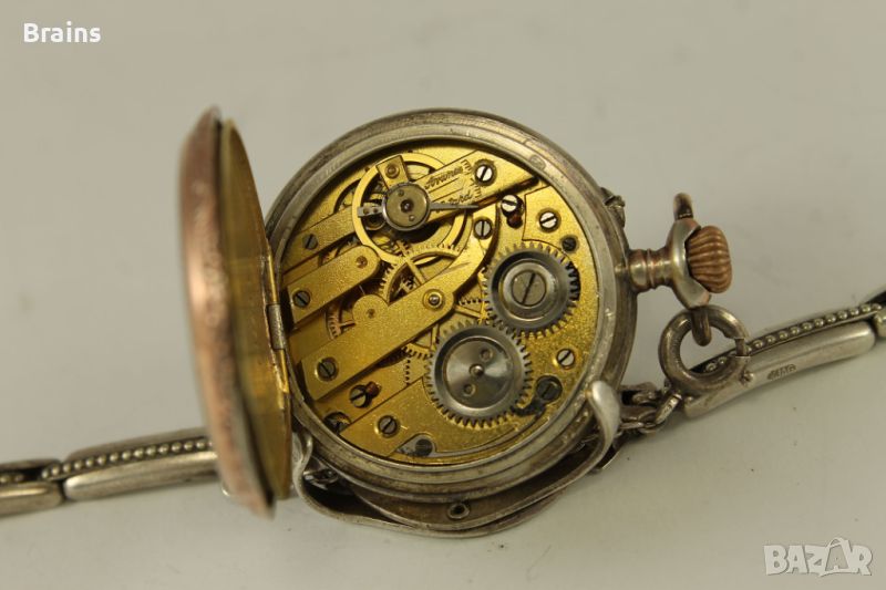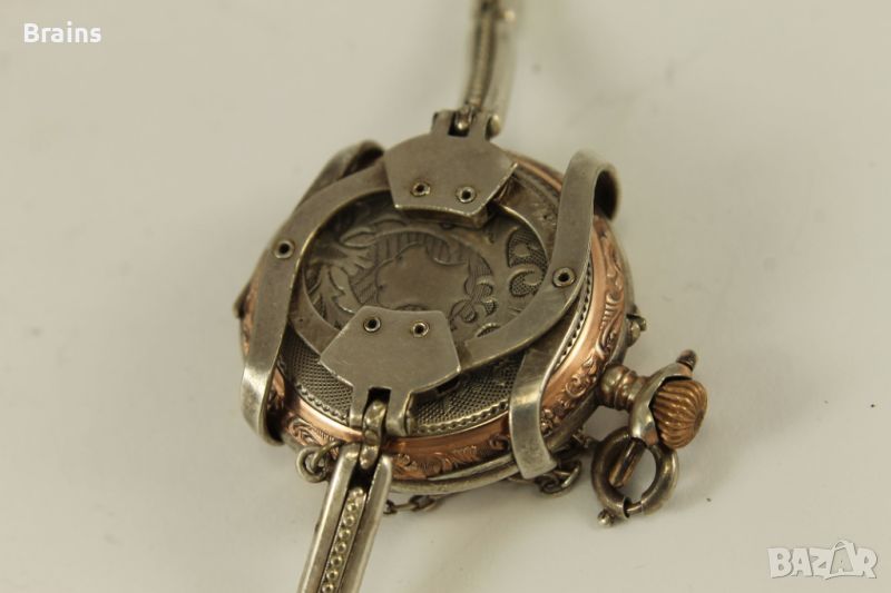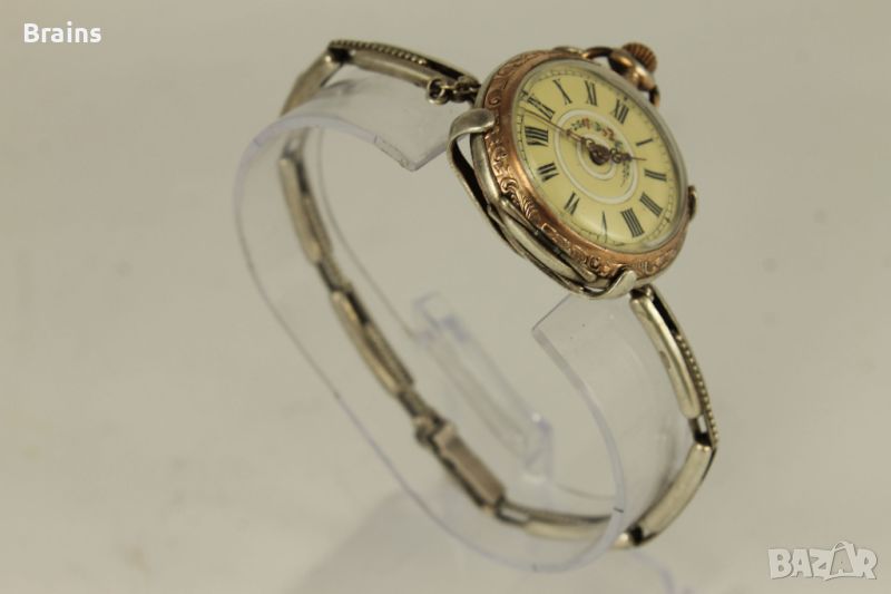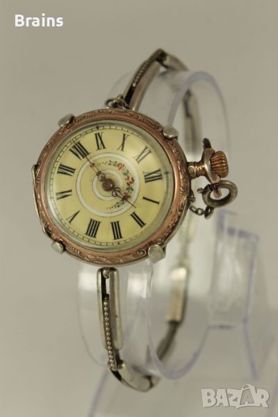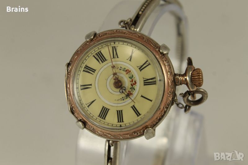 Много красив Швейцарски дамски сребърен джобен часовник цилиндър от края на 19 век. Трансформиран в ръчен часовник, със сребърна разтегателна гривна със закопчалка.Порцеланов циферблат в отлично състояние. Красиви абажурни стрелки. Сребърни капаци, сребърна гривна. Капаците са в отлично състояние без кривини. Отлично работеща машина. Рядко изпълнение.