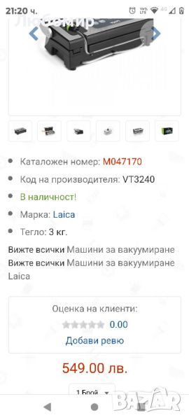 машина за вакуумиране Laica VT3240 с нея е бързо и лесно домашното консервиране. Вакуумирането на различните видове храни става за секунди, Резултат с изображение за топ продукт чрез опаковане в херметически затворени пликове. Перфектният избор за запазване на пресни билки, бланширани зеленчуци и мариновано месо. Всмукателна сила e -0.9 бара и с бързина на изсмукване 22 л / мин. Laica VT3240 вакуумира и запечатва напълно автоматично, чрез натискане на един бутон. Вакуумираните храни остават свежи за по-дълго време, защото не се окисляват, и не позволяват развитието на гъбички и бактерии в плика. Храната запазва свежестта си за дълго време и може да се съхранява замразена с месеци. С професионалната машина за вакуумиране Laica VT32400 ще запазвате за по-дълго време хранителни продукти като риба, месо, зеленчуци и плодове. Машината за вакуумиране може да запечатва гофрирани пликове с максимална ширина до 30 cm, а максималната дължина на запечатване е неограничена. Laica VT3240 е предназначена за постигане на професионални резултати в домашни условия. Работно налягане -0,9 bar, което ви позволява да удължите времето за съхранение на хранителните продукти до 8 пъти повече в сравнение с останалите вакуум машини. Освен пресни продукти може да вакуумирате и замразени хранителни продукти, така че да ги запазите за по-дълго време при съхранение в камерата на хладилника или фризера. Машина за вакуумиране Laica VT3240 е перфектна за вакуумиране на бързо развалящи се и трошливи хранителни продукти. В комплекта на машината за вакуумиране Laica VT3240 са включени 2 ролки за вакуумиране на хранителни продукти.