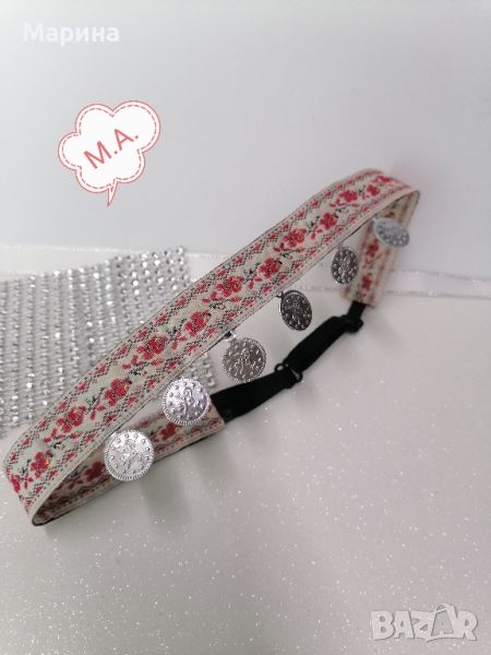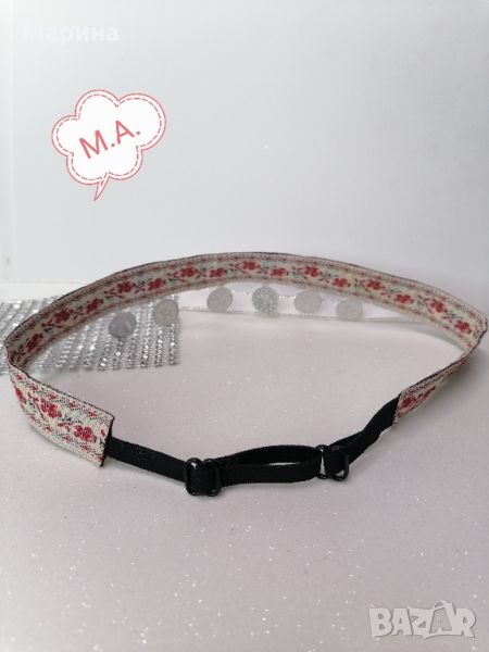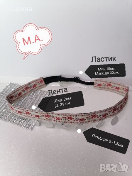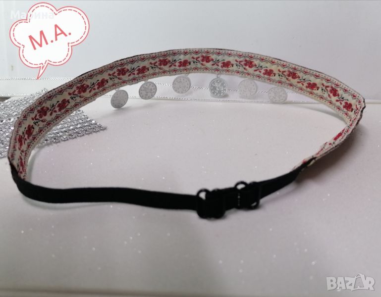 Ширина на косичник 2см., пендари златисти d-15мм., дължина на лента 39см., ластикът се регулира.
