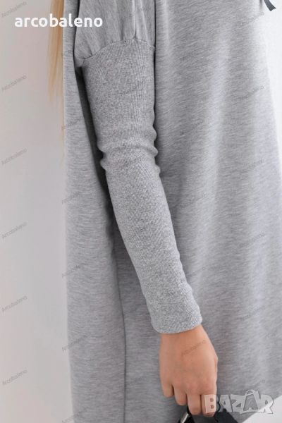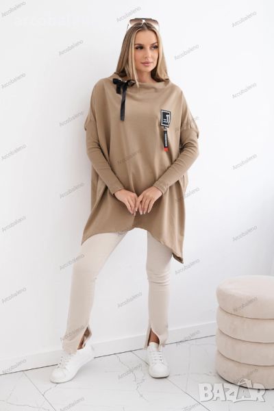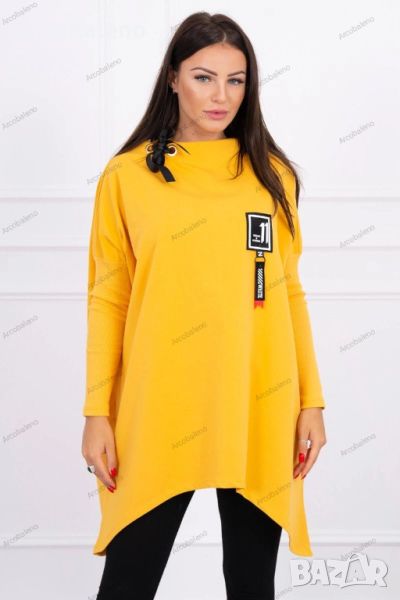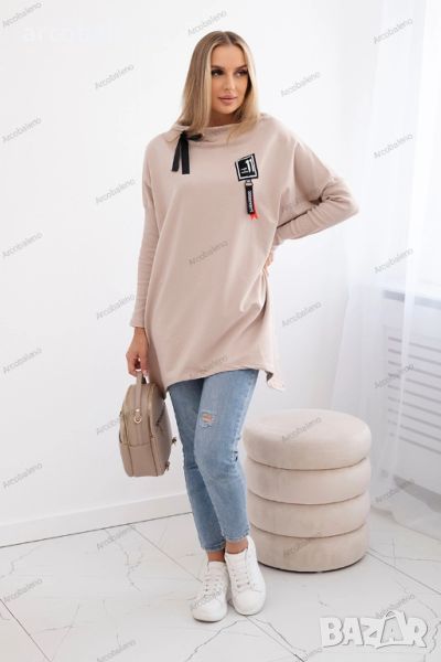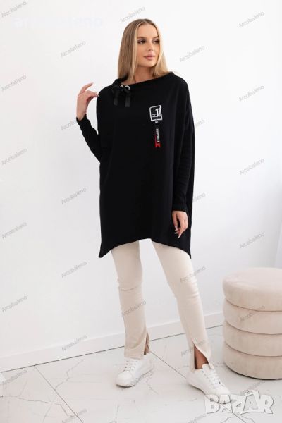 Представяме ви удобен суичър. Суичърът е с по-дълги страни. Декоративна лента около врата. Оребрени ръкави. Суичърът е изработен от висококачествена материя. Размерът е универсален и ще бъде подходящ за жени, носещи размери M, L или XL.