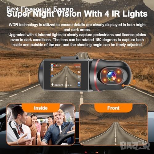 Двуканална видеокамера за кола: Едновременно записва отпред и вътре в колата с резолюция 1080P предна и 720P вътрешна камера.
