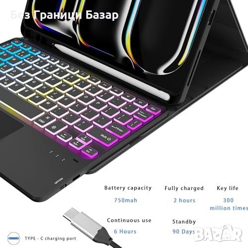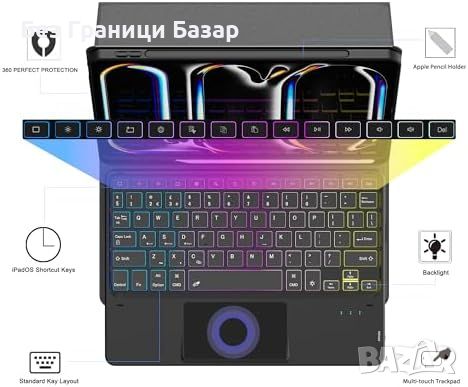 Нов Калъф с Клавиатура за таблет iPad Pro 11 2024, Подсветка 7 Цвята